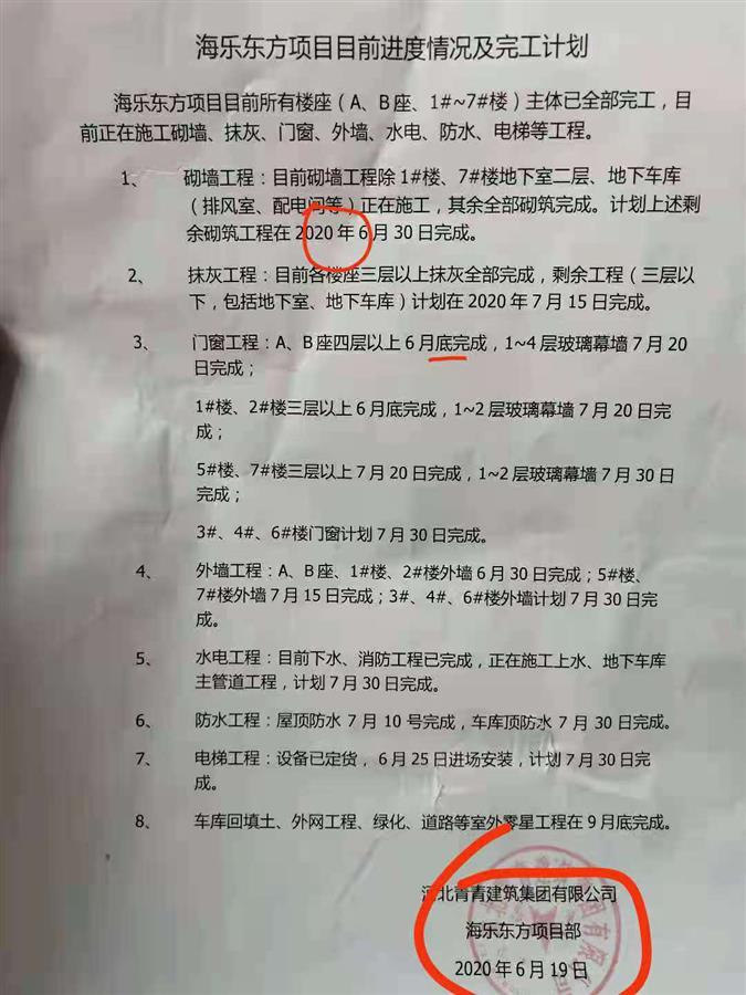 有业主称,她今年6月7日收到永年区住建局的书面回复,称该项目已全部恢复施工,并责成开发企业作出承诺,保证在2021年7月底前完成配套给排水、供电等工程,9月底前完成小区内道路和绿化施工,10月1日达到交付入住条件。
