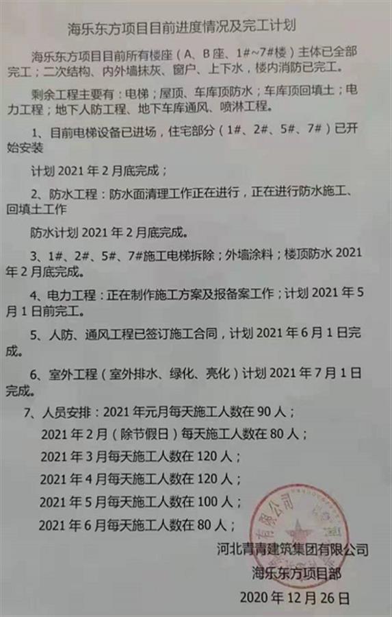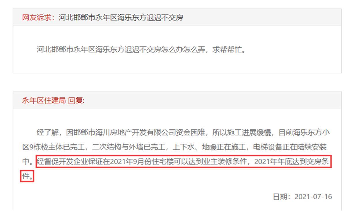 2021年7月16日,永年区住建局回复网友提问称,因邯郸市海川房地产开发有限公司资金困难,所以施工进展缓慢,目前海乐东方小区9栋楼主体已完工,二次结构与外墙已完工,上下水、地暖正在施工,电梯设备正在陆续安装中。经督促开发企业保证在2021年9月份住宅楼可以达到业主装修条件,2021年年底达到交房条件。