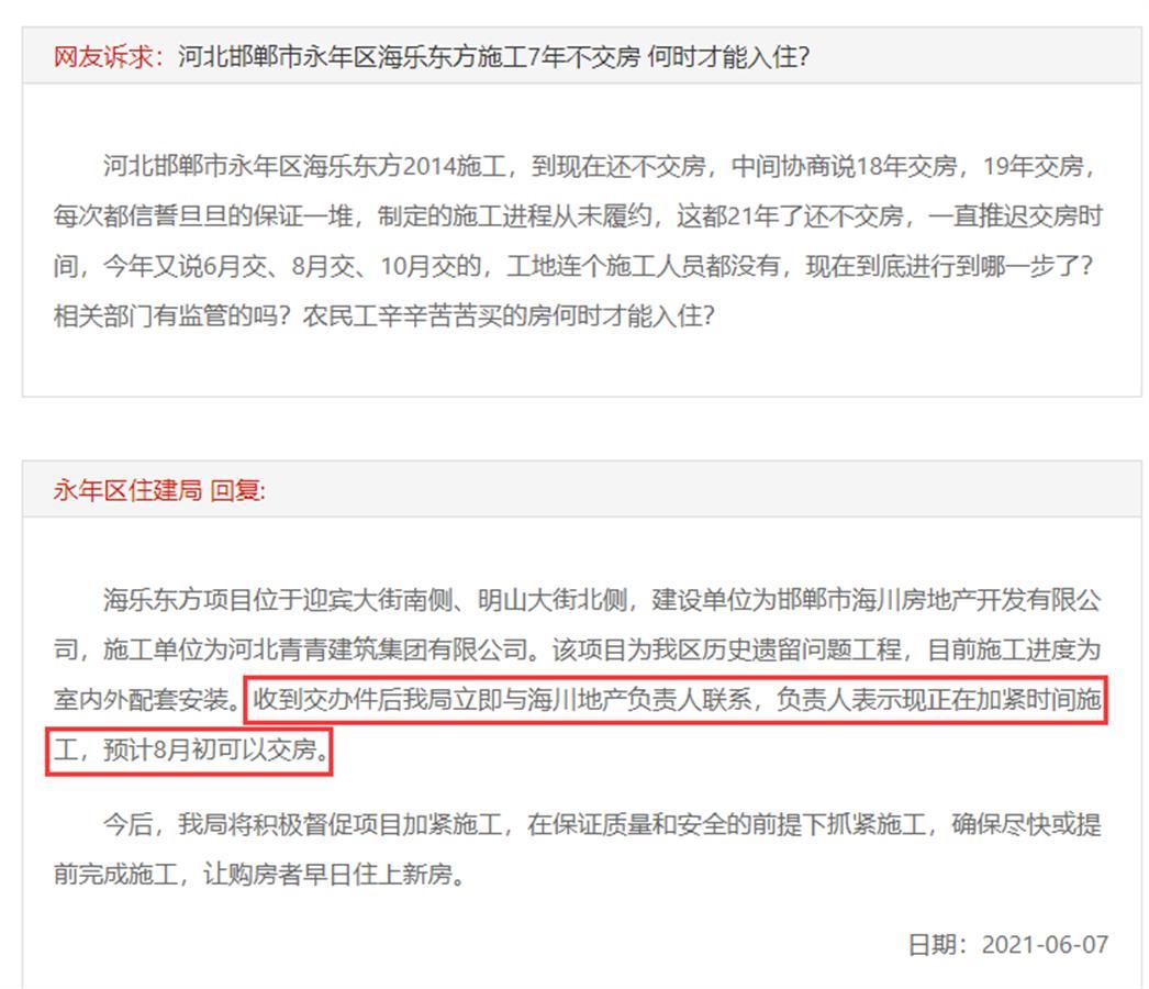 2021年6月7日,有网友在河北省阳光理政平台询问海乐东方小区的交付时间,永年区住建局回复称,该项目为永年区历史遗留问题工程,目前施工进度为室内外配套安装。住建局与海川地产负责人联系,负责人表示现正在加紧时间施工,预计8月初可以交房。