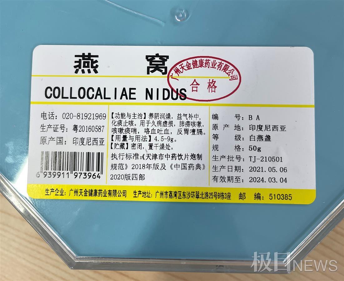 记者看到,陈女士购买的这盒燕窝,生产企业为广州天金健康药业有限公司,标注的生产日期为2021年5月6日,有效期至2024年3月4日。干盏燕窝在保质期内会出现霉变吗?王思露称:有这个可能,原因主要有以下几方面。