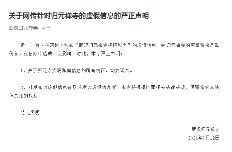 1、关于归元寺招聘和尚信息的所有内容,均为谣言。