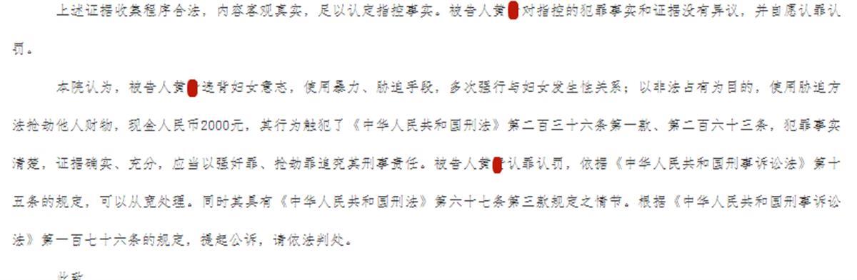 检察机关认为,被告人黄某违背妇女意志,使用暴力、胁迫手段,多次强行与妇女发生性关系;以非法占有为目的,使用胁迫方法抢劫他人财物,现金人民币2000元,应当以强奸罪、抢劫罪追究其刑事责任。