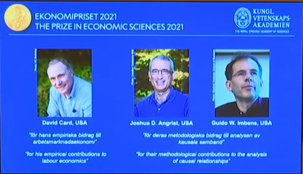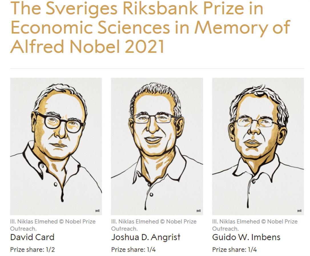 瑞典当地时间10月11日星期一中午,诺贝尔奖委员会正式宣布,3位美国经济学家戴维·卡德(David Card)、乔舒亚·D·安格里斯特(Joshua D.Angrist)以及吉多·W·因本斯(Guido W.Imbens)共同获得获得这一奖项。