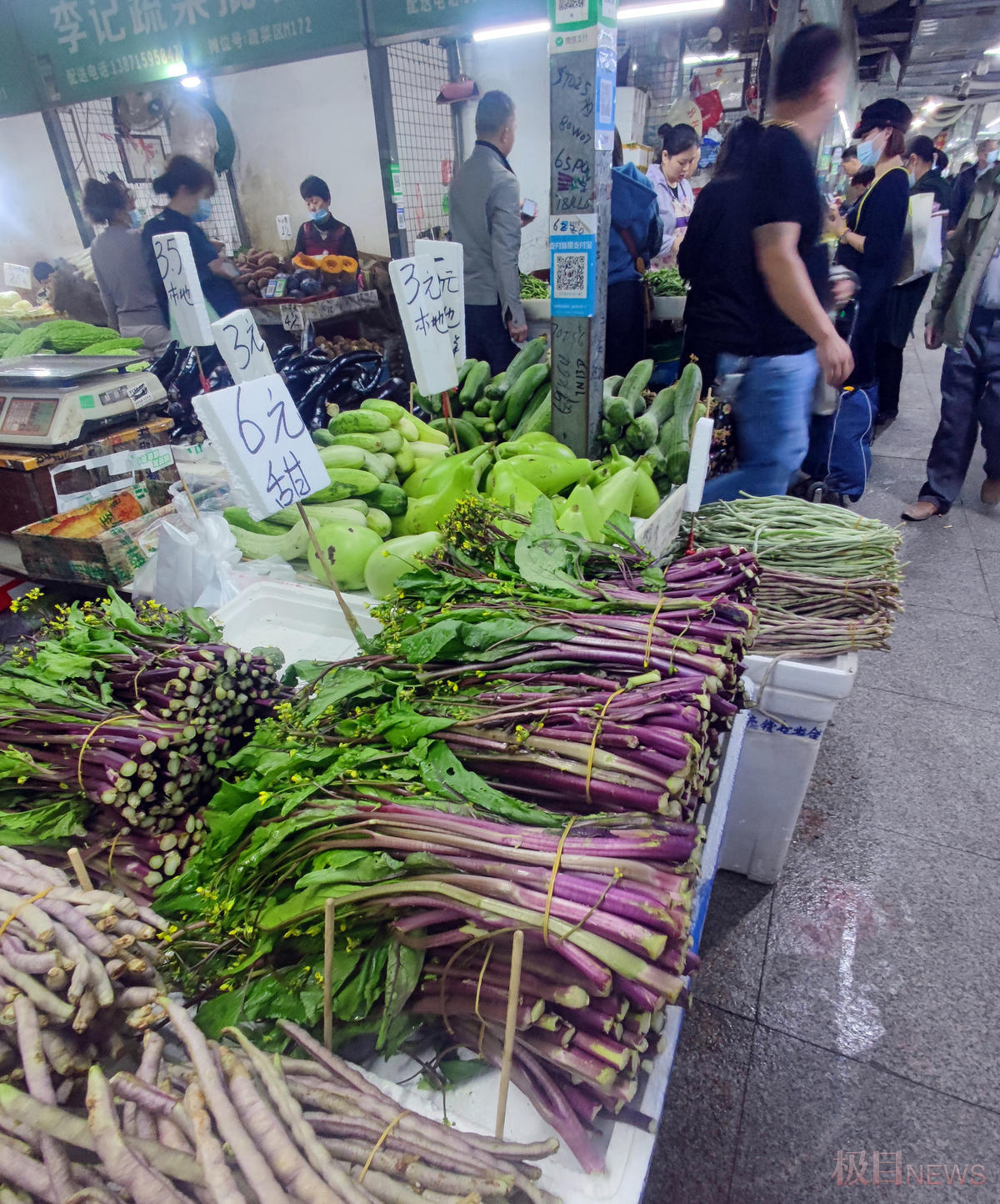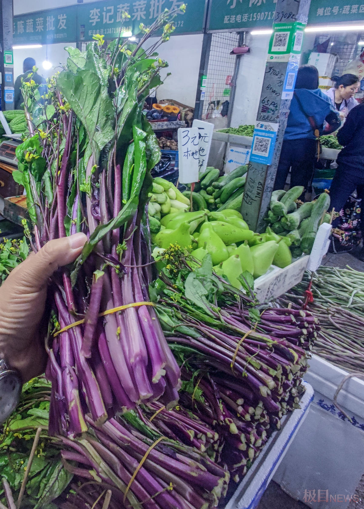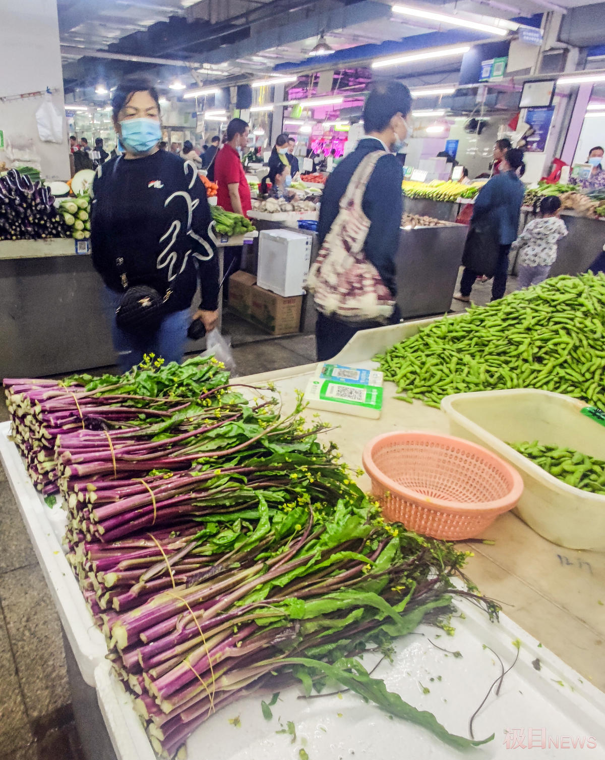 在这家菜市场里,红菜薹的价格明显比其他蔬菜更贵,每斤在7元到8元之间。买了两斤红菜薹的宋阿姨说,虽然现场吃红菜薹肯定不是最美味的时候,但还是忍不住买回去炒来试试,也算是给家里的餐桌上增加一个时令味道。