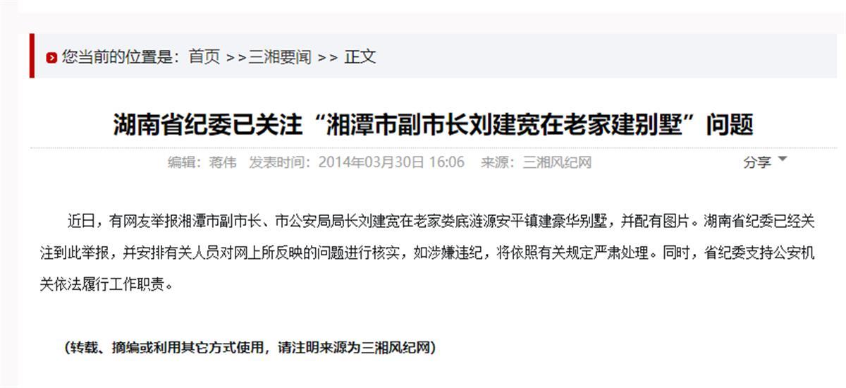 早在2014年,刘建宽就被人举报在老家建豪华别墅。湖南省纪委监委官网三湘风纪网在2014年3月30日通报称,有网友举报湘潭市副市长、市公安局局长刘建宽在老家娄底涟源安平镇建豪华别墅,并配有图片。湖南省纪委已经关注到此举报,并安排有关人员对网上所反映的问题进行核实,如涉嫌违纪,将依照有关规定严肃处理。同时,省纪委支持公安机关依法履行工作职责。