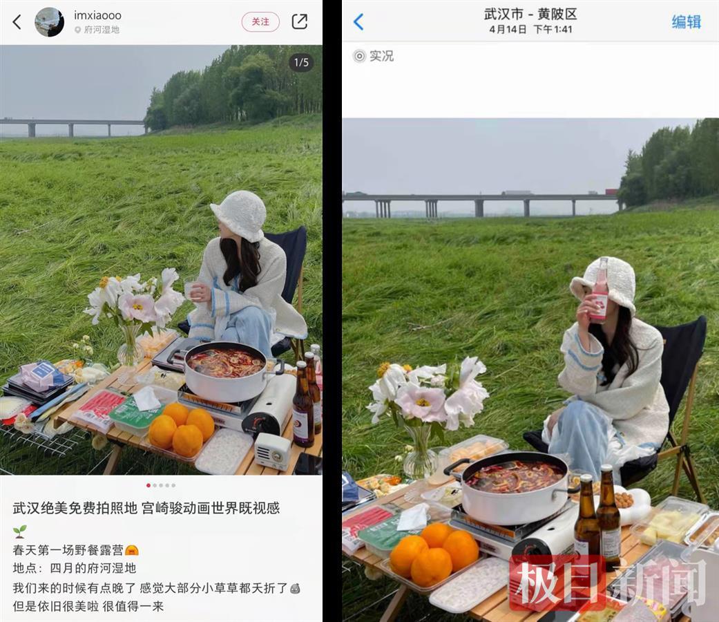 “我们是4月中旬去的。府河湿地很大,我们将车子开到很里面,挑了一块好点儿的草地,那一块就我们一伙人。”“imxiaooo”告诉记者,“我们去的时候实景就是很美,但是可能只有三四月份才那么美,五月份就涨水了。”