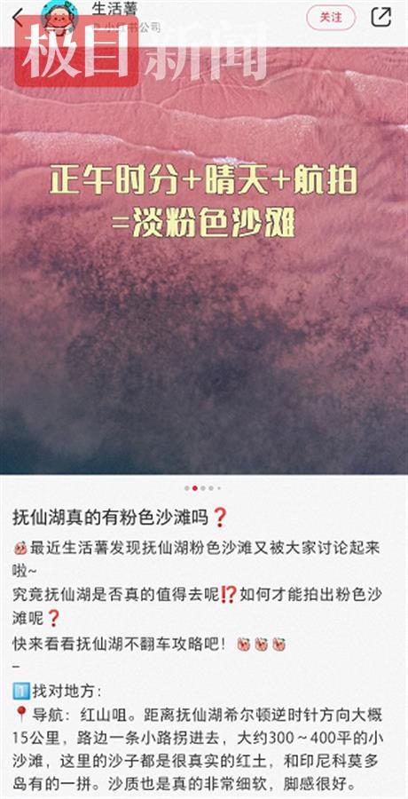 所谓的粉红沙滩位于云南省澄江市抚仙湖西岸的红山咀处,被众多小红书博主称为“国内唯一”“科莫多岛同款”。面对质疑,大力推荐的博主们表示自己绝对没有加滤镜,淡粉色必须要在“正午时分”“晴天”“航拍”才能得到效果。
