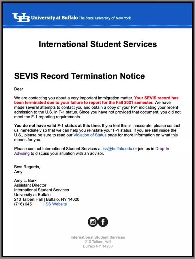 极目新闻记者从布法罗中国学生学者联合会了解到,包括该校在内的美国各个院校,往年都出现过有学生因为个人或外在原因遇到过身份终止的情况,大部分在几个月内得到了解决。学生只需要拿着新的I-20重新出入境(如往返加拿大、墨西哥等地)即可激活学生身份。