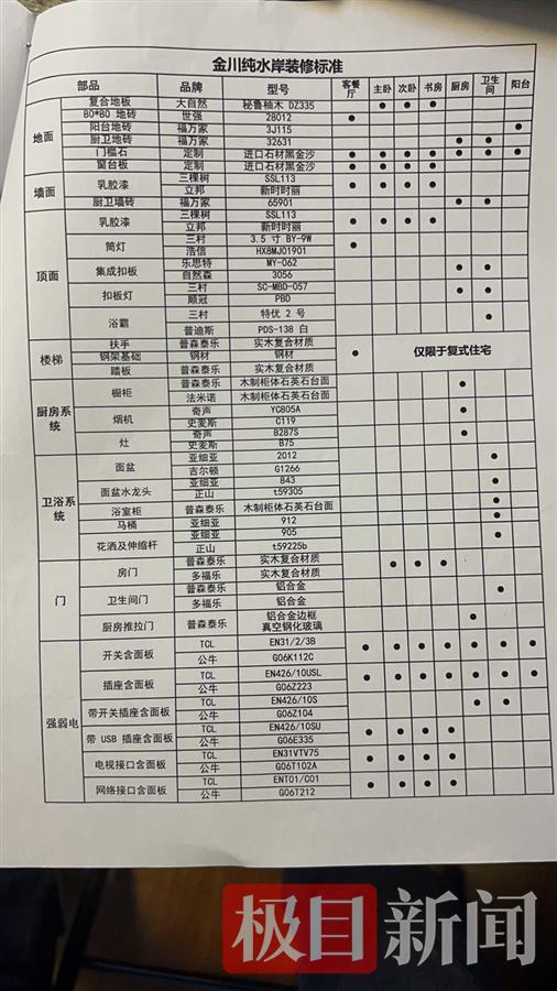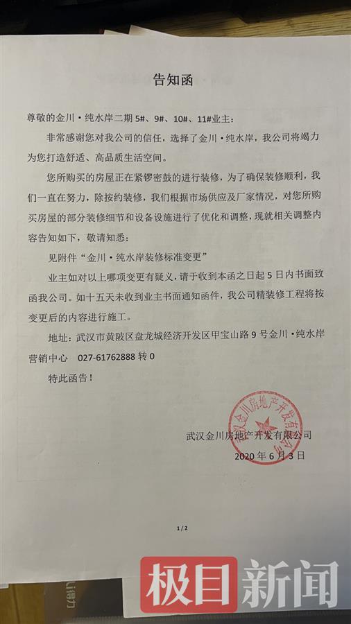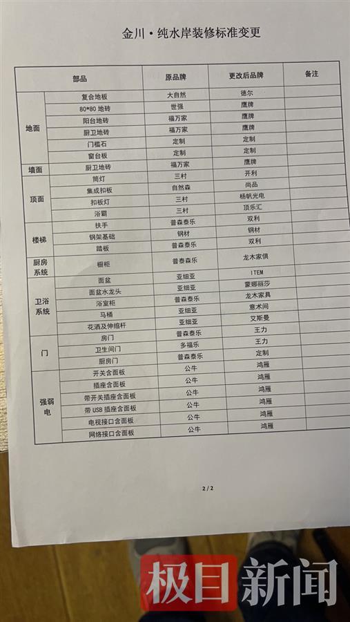 去年6月3日,开发商武汉金川房地产开发有限公司通知业主,因疫情影响,交房日期从2021年6月30日延期至2021年9月30日。此外,当时还给业主发去告知函:房屋正在进行装修,除按约装修,根据市场供应及厂家情况,对房屋的部分装修细节和设备设施进行优化和调整,现将相关调整内容告知如下,如对变更有疑义,请在收到本函之日起5日内书面致函。在开发商提供的金川纯水岸装修标准变更附件中,记者看到,地面、墙面、顶面、楼梯、厨房系统、卫浴系统、门、强弱电等29项部品进行了更改。如复合地板原品牌为大自然,变更为德尔;强弱电由“公牛”变更为“鸿雁”。