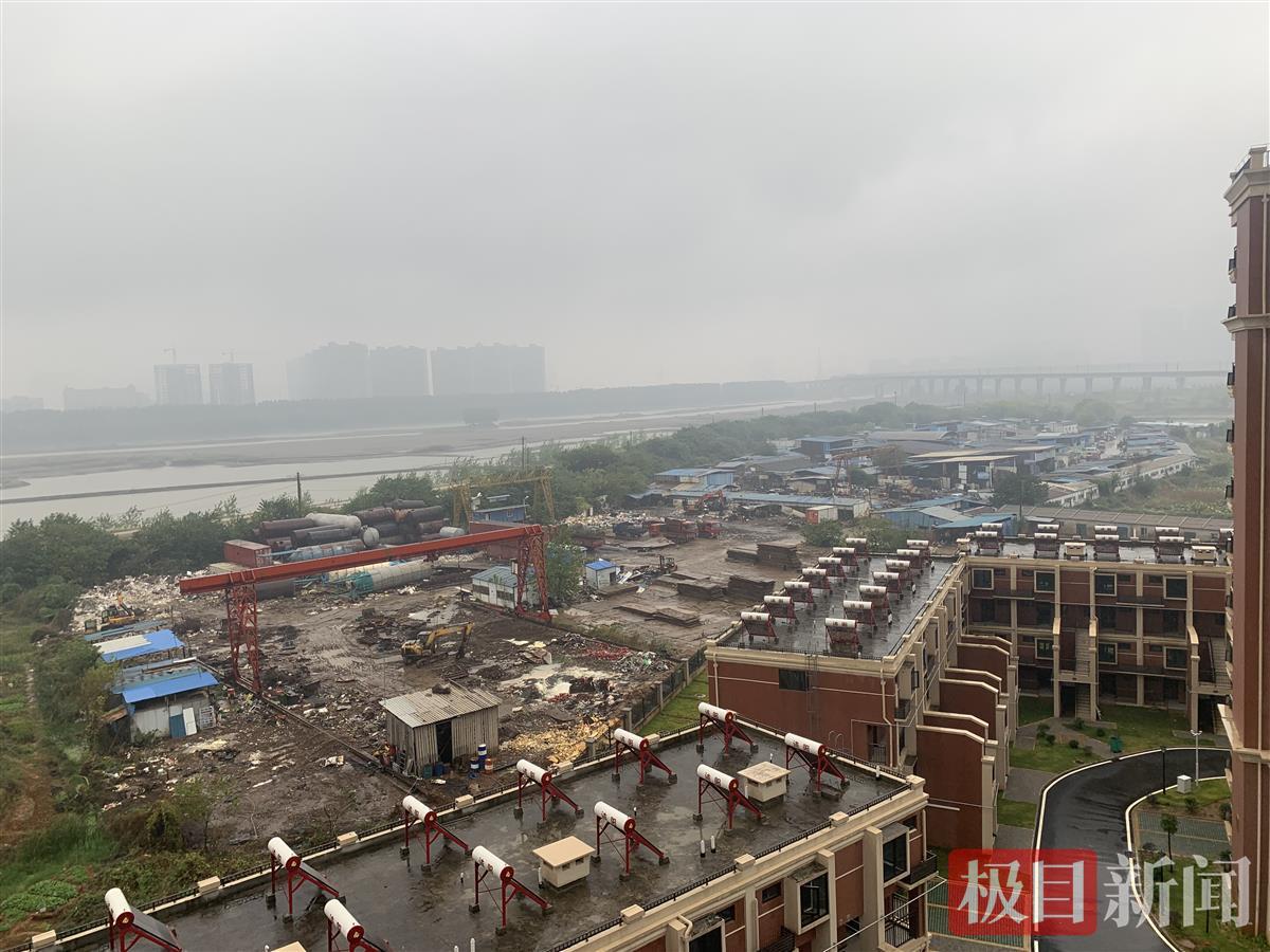 三期的业主何先生表示,他看房时曾注意到项目外在施工和龙门吊,销售人员说以后会修建成公园,没想到是一处物资废铁场。10月20日,极目新闻记者从小区11栋10楼望去,废旧金属回收市场紧邻小区,不时传来响声,还能闻到异味,进出道路破损,场内堆了不少废旧金属及杂物,不远处就是府河。