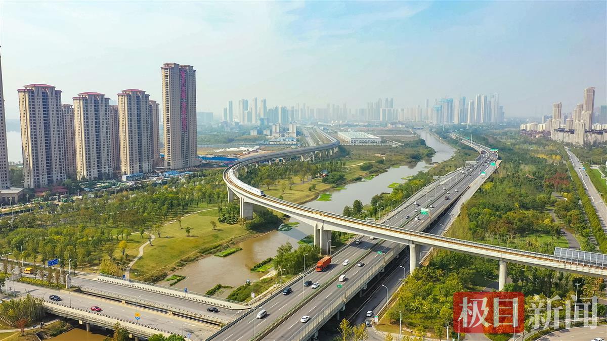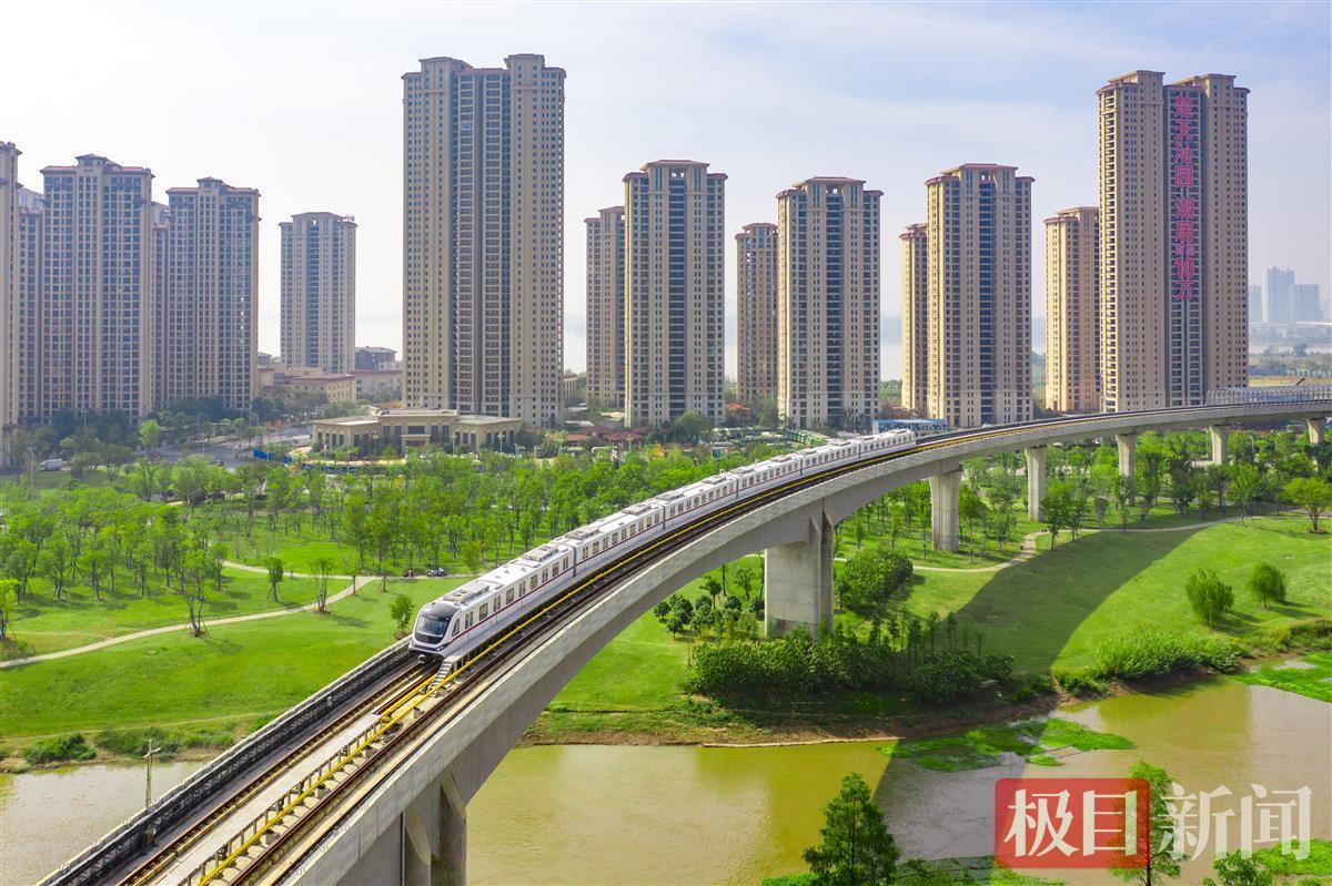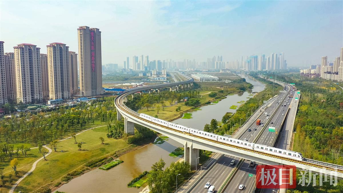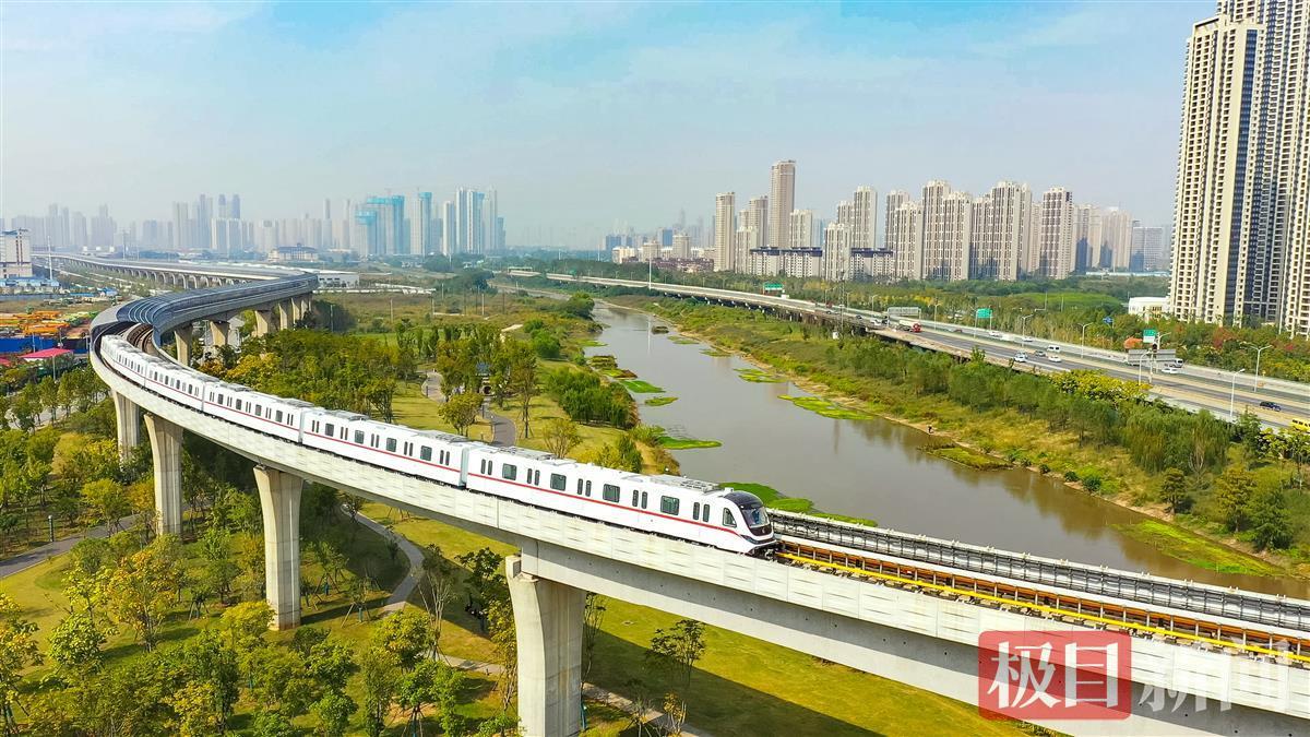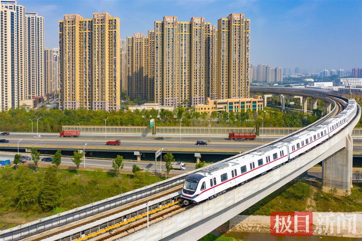 10月25日,在武汉市洪山区烽胜路,一列崭新的“首义红”地铁列车驶过飞跨青菱河的高架段,从中医药大学站驶往白沙六路方向。