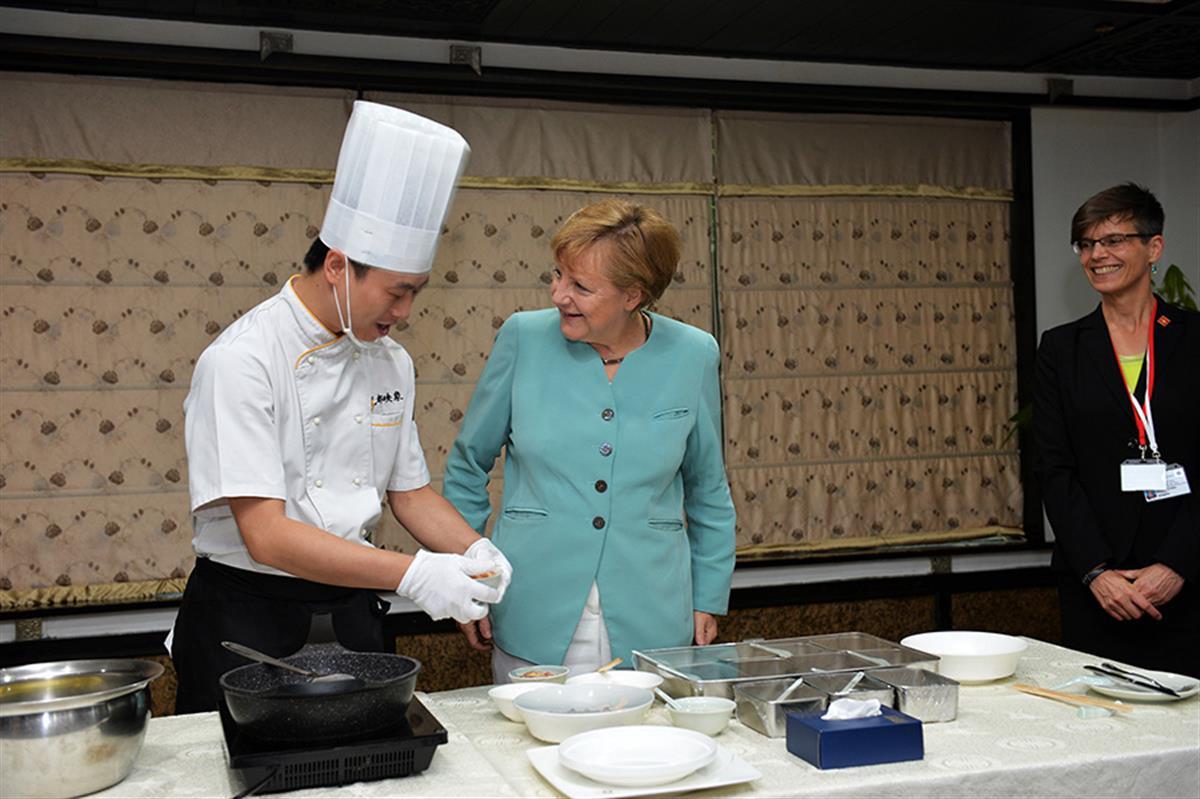 随后,默克尔来到一家川菜馆,在厨师的指导下,“学习”川菜经典菜品宫保鸡丁的制作。在翻译的协助下,厨师详细地解说着烹饪的每一个步骤和技巧。虽然最终默克尔并没有亲自动手烹饪这道菜,但她表现出极大的兴趣。一盘色香味俱全的宫保鸡丁出炉后,默克尔熟练地拿起筷子品尝起来。