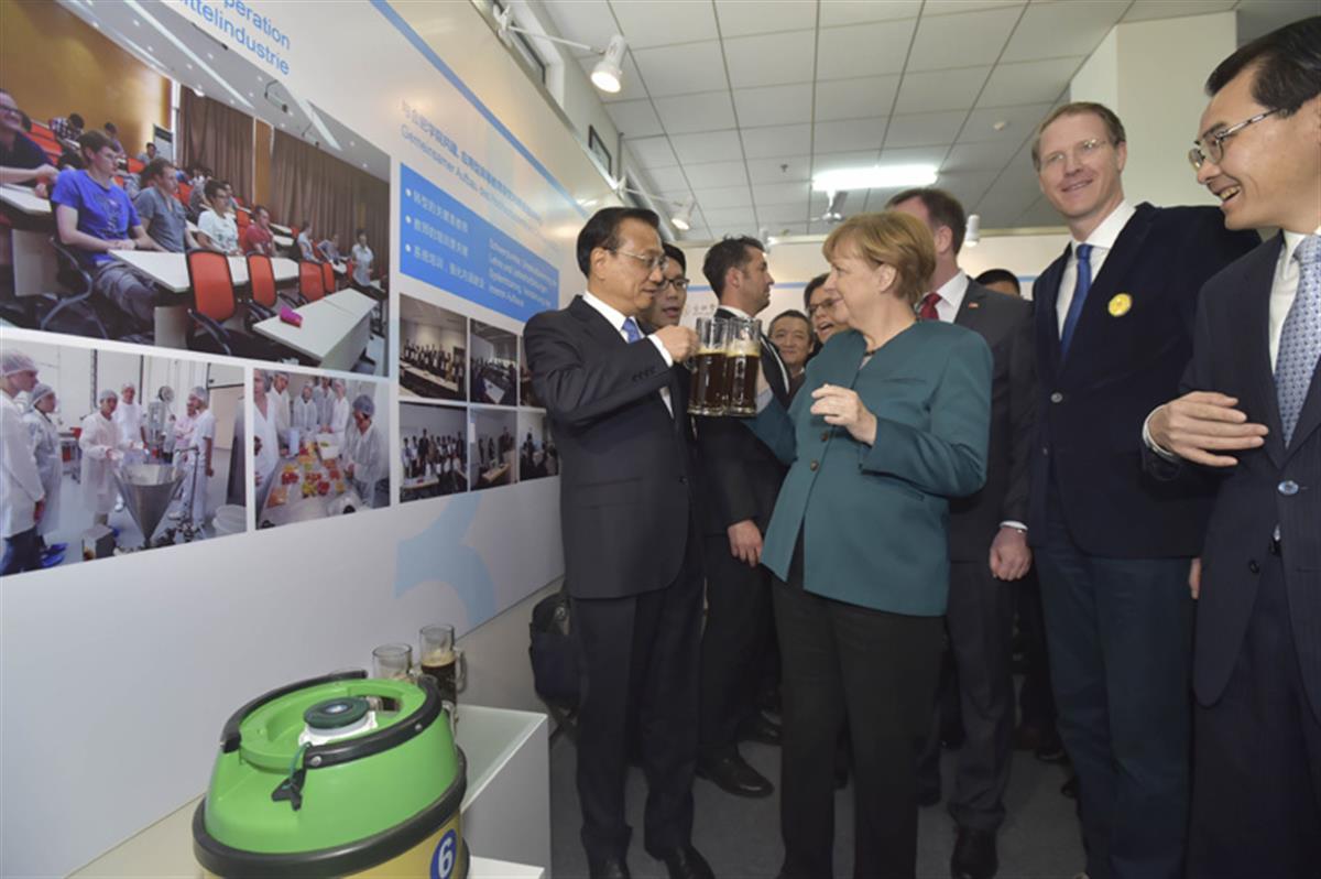 2015年10月,李克强总理和默克尔来到中德两国共建的安徽合肥学院,在食品专业交流合作展区共同品尝该校学生酿制的德国黑啤。