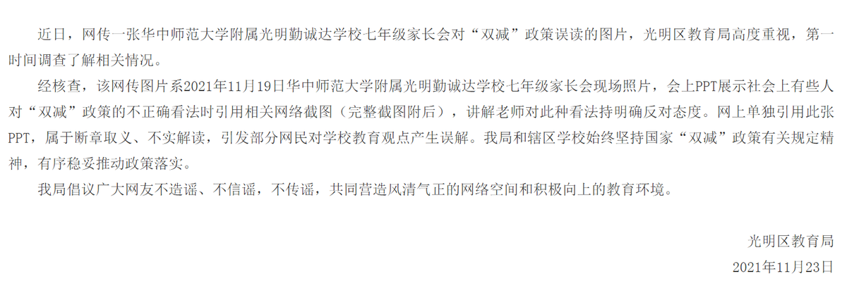 深圳市光明区教育局一名工作人员告诉记者,他们22日晚看到了这则消息,立即向学校核实。学校介绍了现场情况,并将PPT发送给教育局。据了解,网传的这张PPT前面还有一句话,是说社会上有些人对双减的看法,下一页放出了援引的这段话。校方并非要宣传这样的思想,当时老师正在进行“双减”政策解读,说了社会上有些人对“双减”的看法,后面接着说《中华人民共和国家庭教育促进法》是怎么样的,家长应该怎么做,还说“双减”不减父母的担当,不减习惯的培养,不减陪伴的质量,不减家校的配合等等,做一个正向的引导。教育局也将会就此事发布通报。