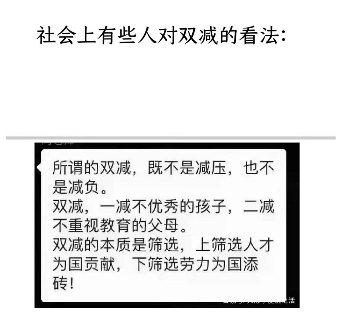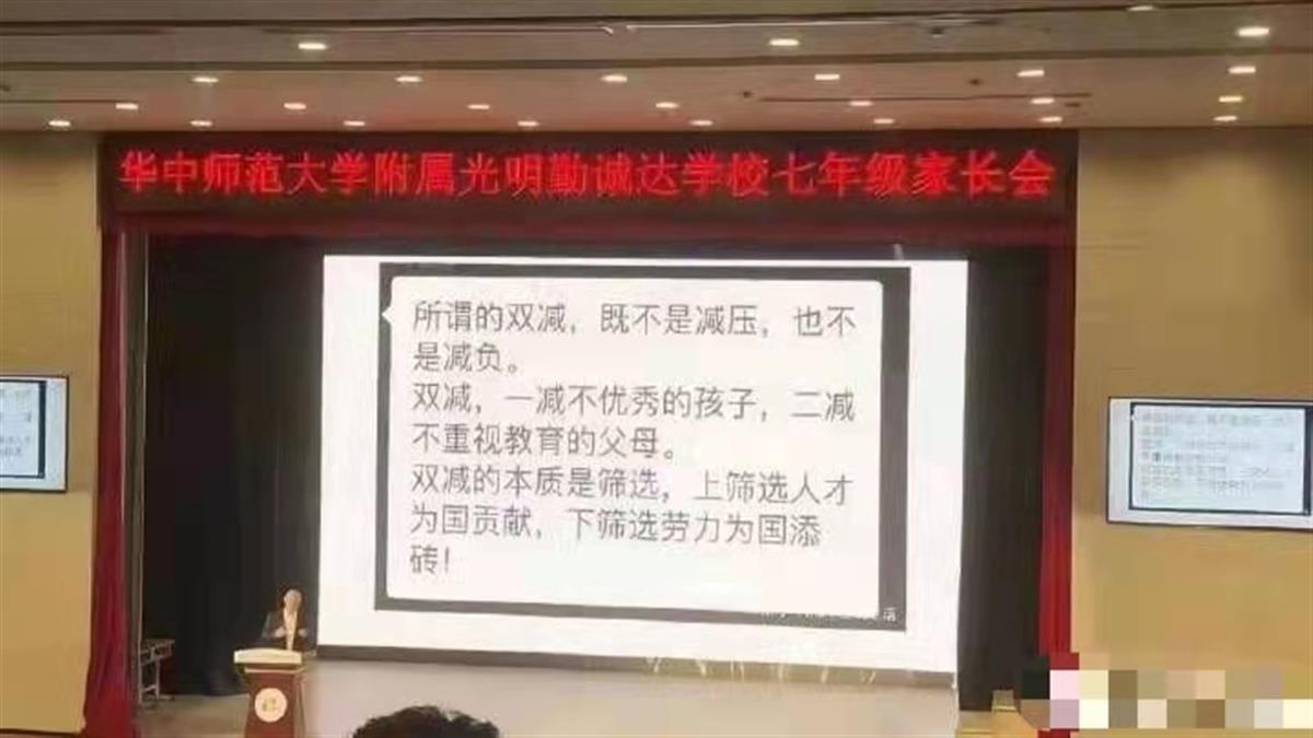 网传图片显示,在华中师范大学附属光明勤诚达学校七年级家长会上,一人站在台上,背后的大屏幕上出现一段话,内容为:“所谓的双减,既不是减压,也不是减负。双减,一减不优秀的孩子,二减不重视教育的父母。双减的本质是筛选,上筛选人才为国贡献,下筛选劳力为国添砖!”图片的相关内容迅速引起网友热议。