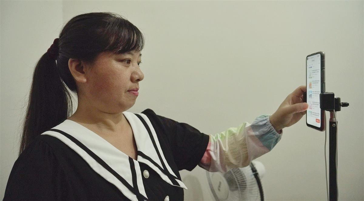 每天晚上,洗好碗叠好衣服之后,吕帅霞就换上一身漂亮的衣服,支起直播架,对着手机开始播。直播的内容不外乎聊聊天,唱唱歌,随意上架的商品成交量并不高,从一个月几十块到几百块,但吕帅霞已经很满足了。
