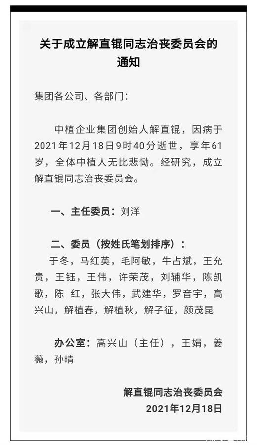 12月18日晚20时,“中植企业集团”官方微信发布讣告:中植企业集团创始人解直锟先生,因心脏病突发抢救无效,于18日9时在北京逝世,享年61岁。与此同时,公布了解直锟治丧委员会名单,其中包括妻子毛阿敏、陈凯歌、陈红等。
