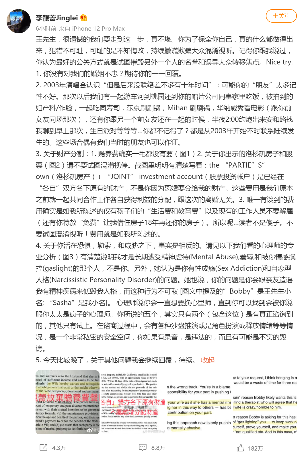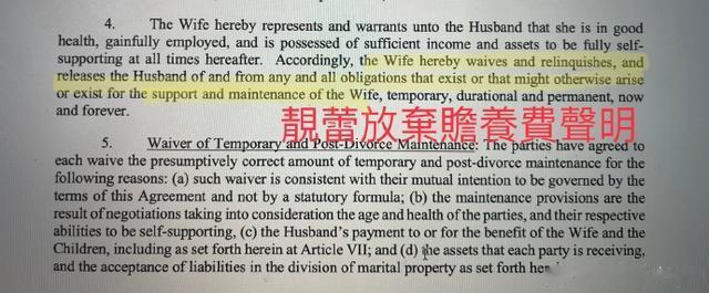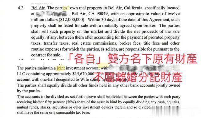 3. 关于财产分割:1. 赡养费确实一毛都没有要(图1)2. 关于你出示的洛杉矶房子和股票(图2)请不要试图混淆视停。截图里明明有清楚写着:the “PARTIE”S” own(洛杉矶房产)+ “JOINT” investment account(股票投资帐户)是已经在“各自”双方名下原有的财产,不是你因为离婚要分给我的财产。这些费用是我们原本之前就一起共同合作工作各自获得利益的分配,跟这次的离婚无关。3. 唯一有谈到的费用确实是如我所陈述的仅有孩子们的“生活费和教育费”以及现有的工作人员不要解雇(还有你特赦“免费”让我借住房子18年再还你的房子)。所以呢…读者不是傻子。不要试图混淆视听!费用就是如我所陈述的。