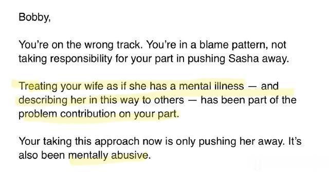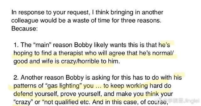 4. 关于你活在恐惧,勒索,和威胁之下,事实是相反的。请见以下我们看的心理师的专业分析(图3)有清楚说明我才是长期遭受精神虐待(Mental Abuse),羞辱,和被你情感操控(gaslight)的那个人,不是你。另外,她认为是你有性成瘾(Sex Addiction)和自恋型人格(Narcissistic Personality Disorder)的问题。她也说,你的问题是你会跟亲友造谣我有精神疾病来低毁我人格,而这种行为不可取 [图文中提及的”Bobby”是王先生小名; “Sasha”是我小名]。 心理师说你会一直想要换心里师,直到你可以找到会被你说服你太太是疯子的心理师。你所说的五个,其实只有两个(包含这位)是有真正谘询到的,其他只有试上。在谘商过程中,会有各种沙盘推演或是角色扮演或释放情绪等等情况,是一个非常私密的安全空间,你如果有录音,是违法的,而且有可能是不实的毁谤。