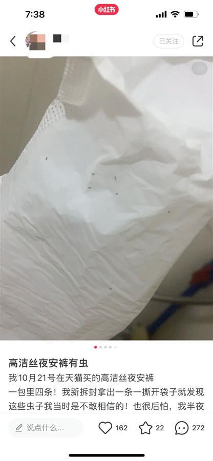 该声明称,公司目前已与消费者取得了联系,待取得产品后,将积极通过第三方专业机构进行检测。此外,高洁丝还称公司产品的生产环境严格遵照国家卫生标准,秉承严格的品控管理,全封闭生产并经高温工艺环节,生产车间具有卫生防虫设计,该环境内虫子和虫卵无法生存。