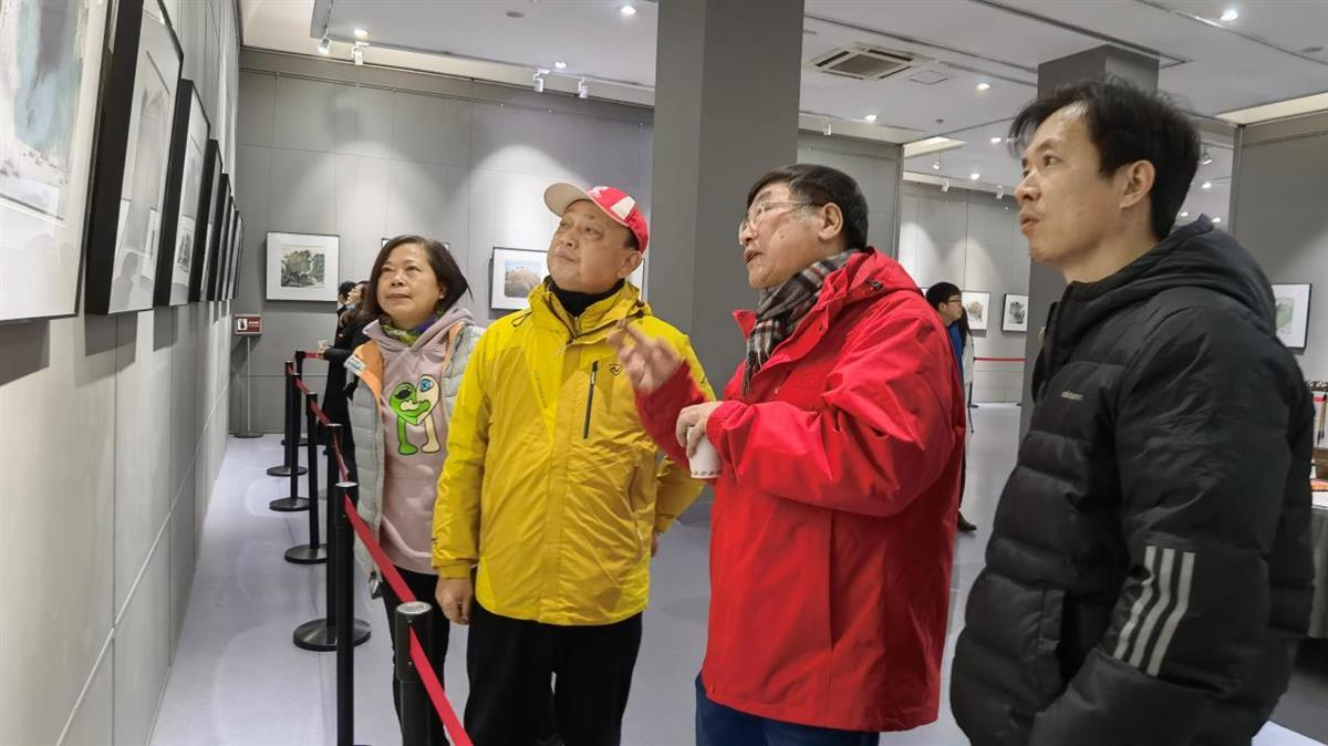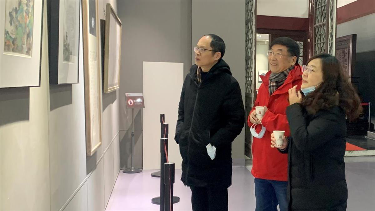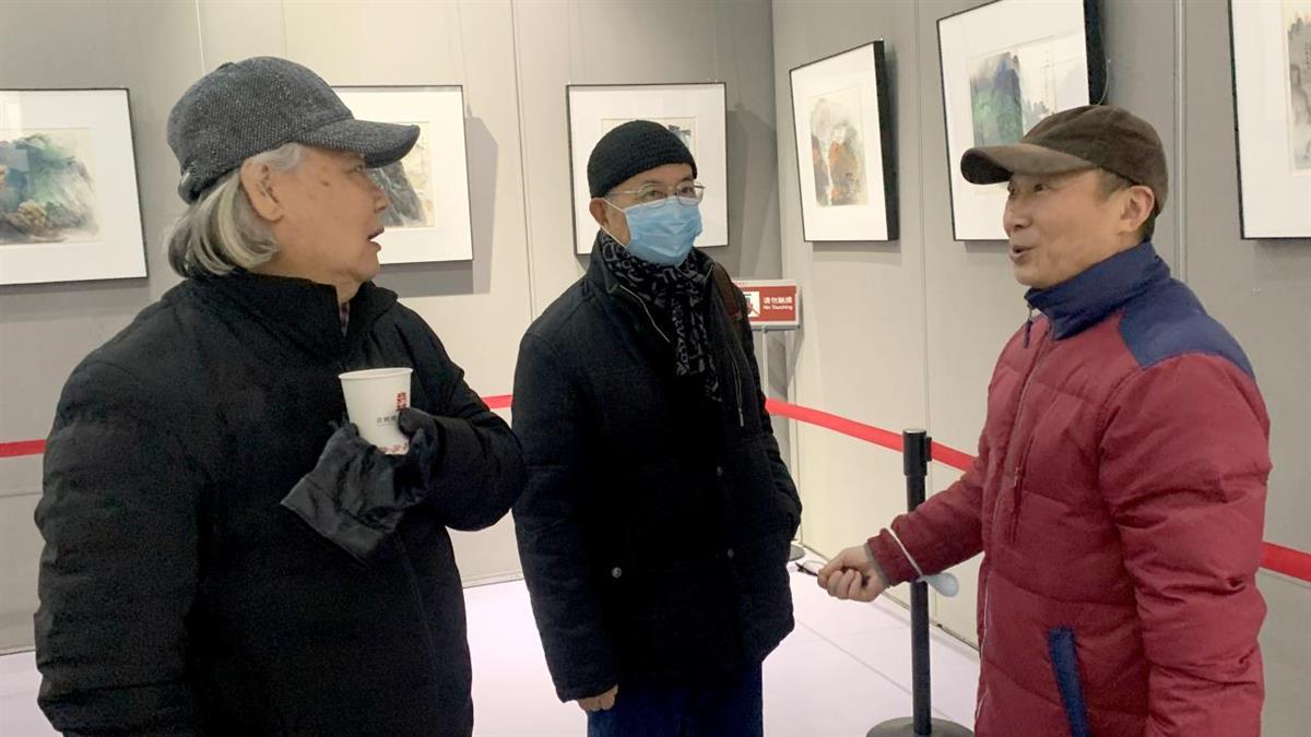 左起:湖北省中国画学会执行会长魏金修、中南民大美术学院原院长钟孺乾、湖北书画院副秘书长刘亦农在展厅看展交流