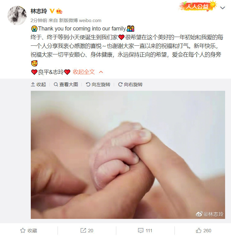 就在刚刚,林志玲在社交媒体上宣布生子。林志玲发文称:终于、终于等到小天使诞生到我们家。很希望在这个美好的一年初始和我爱的每一个人分享我衷心感激的喜悦~也谢谢大家一直以来的祝福和打气。新年快乐,祝福大家一切平安顺心、身体健康,永远保持正向的希望,爱会在每个人的身旁。