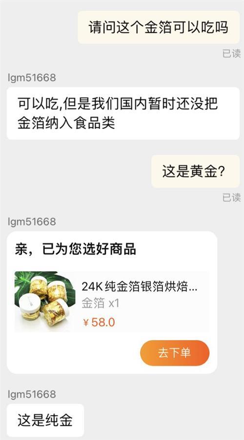 客服回答:“可以吃,但我们国内暂时还没有把金箔纳入食品内。”