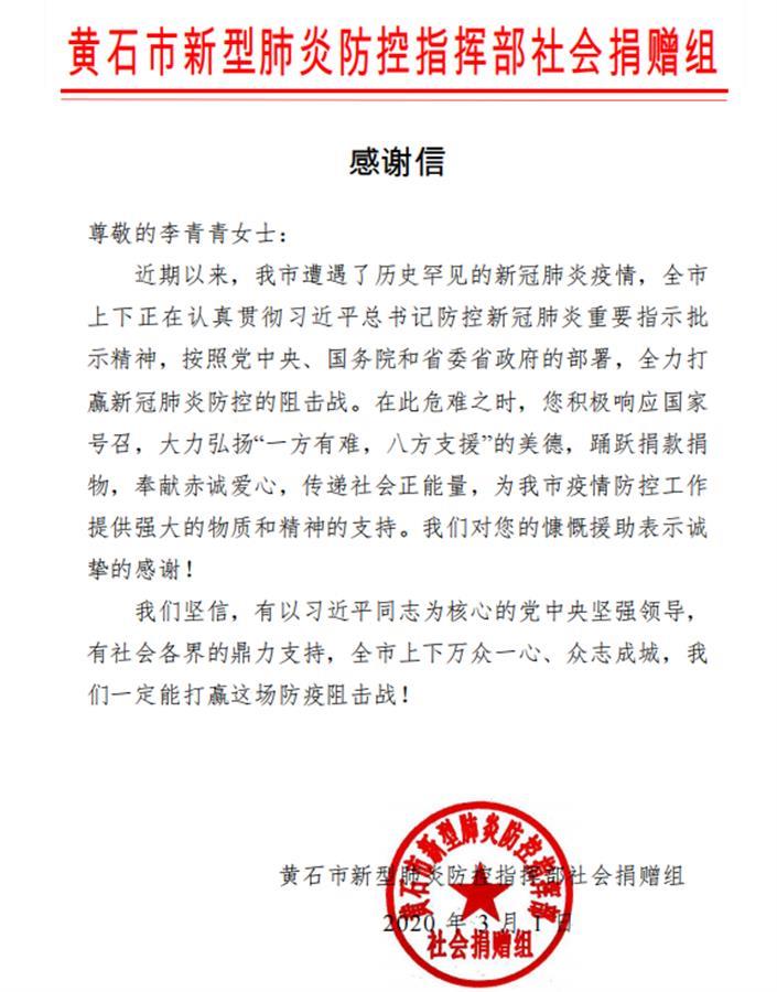 “我们对您的慷慨援助表示诚挚的感谢!2020年3月1日,黄石市新型肺炎防控指挥部社会捐赠组致信感谢。从N95口罩到防护服,甚至连当时最紧缺的呼吸机,李青青前后共联系了68台捐赠给家乡各医院及卫生院等。包括黄石市第四人民医院、黄石妇幼保健院、大冶总医院、阳新妇幼保健院等。“感谢李青青的大爱保护了我们医护人员及广大妇女和儿童的健康及安全。她极强的爱国心、家乡情和社会责任感,以及她执着和敬业精神,感动了我们每一个人。在那个最艰难的时候,是她在为我们护航。我们全体医护人员都特别感谢她。”黄石妇幼保健院江鸿院长说。同时,她还帮助了铁山小学、黄石五中、黄石大冶铁矿中学、湖北师范大学等从各小学到大学的防护服及消毒酒精等紧缺抗疫物资的捐赠。
