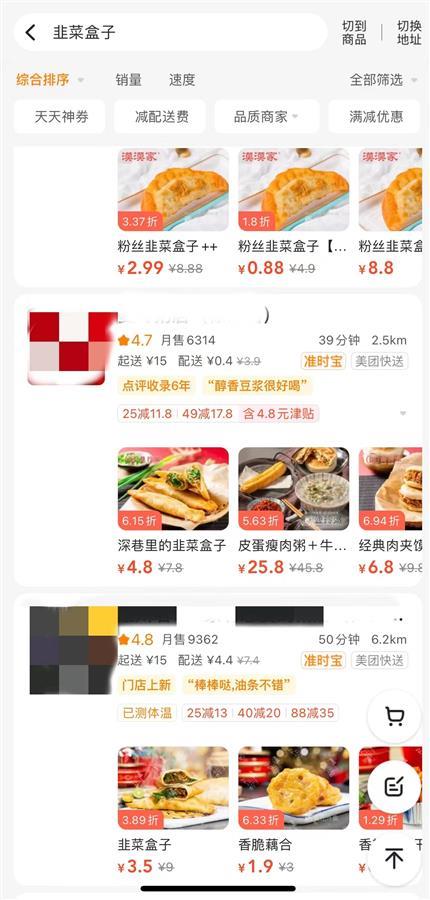 记者搜索发现,不少商家注意到了这一热点,除了上新、置顶外,还有很多外卖商家做起了韭菜盒子促销,价格低至3折。