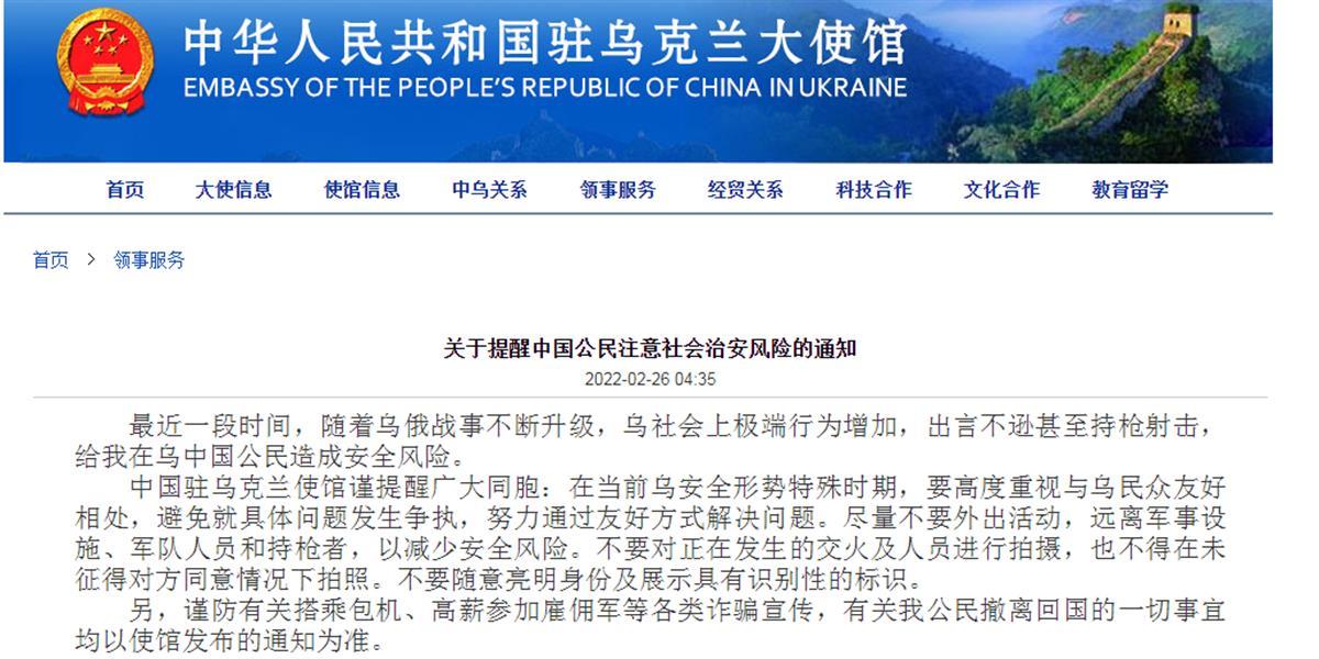 据悉,北京时间26日下午,中国驻乌克兰大使馆在发布的《关于提醒中国公民注意社会治安风险的通知》称,最近一段时间,随着乌俄战事不断升级,乌社会上极端行为增加,出言不逊甚至持枪射击,给我在乌中国公民造成安全风险。