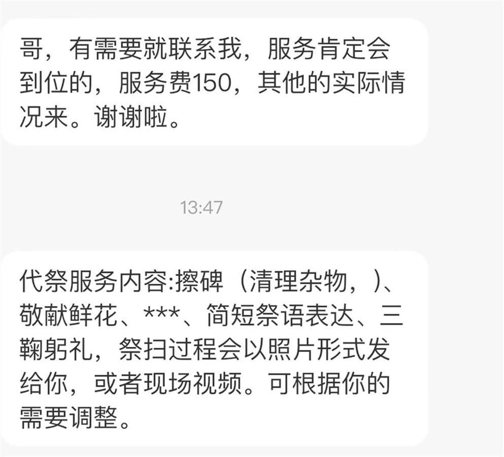 “于是我就在二手交易平台发布了相关服务。”小方告诉极目新闻记者,自己接受武汉周边的订单,单次服务费150元。“路费另付,香烛、酒水、水果、点心、鲜花等由顾客选择,我代为购买。”小方表示,在祭扫时,自己会拍摄视频和图片,以此向顾客提供可视化服务。