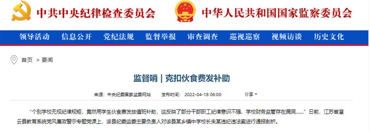 4月18日,中央纪委国家监委网站公布了一起挪用学生伙食费的案例。江苏省灌云县一乡镇中学,竟然把学生交的伙食费拿去发放值班补助。被群众举报后,该校校长、副校长和后勤主任都被处分。