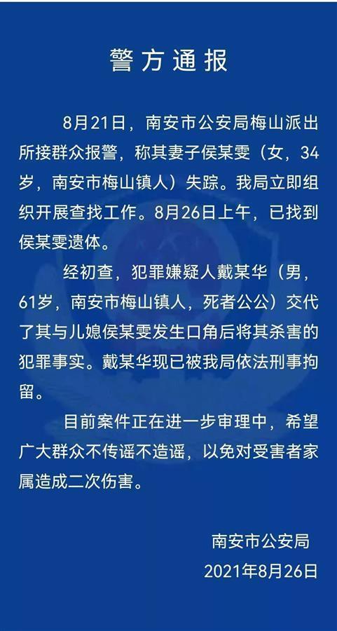 2021年8月26日,南安市公安局发布通报称,小雯遗体被找到。经初查,犯罪嫌疑人戴某华(男,61岁,南安市梅山镇人,死者公公)交代了其与儿媳小雯发生口角后将其杀害的犯罪事实。戴某华被该局依法刑事拘留。