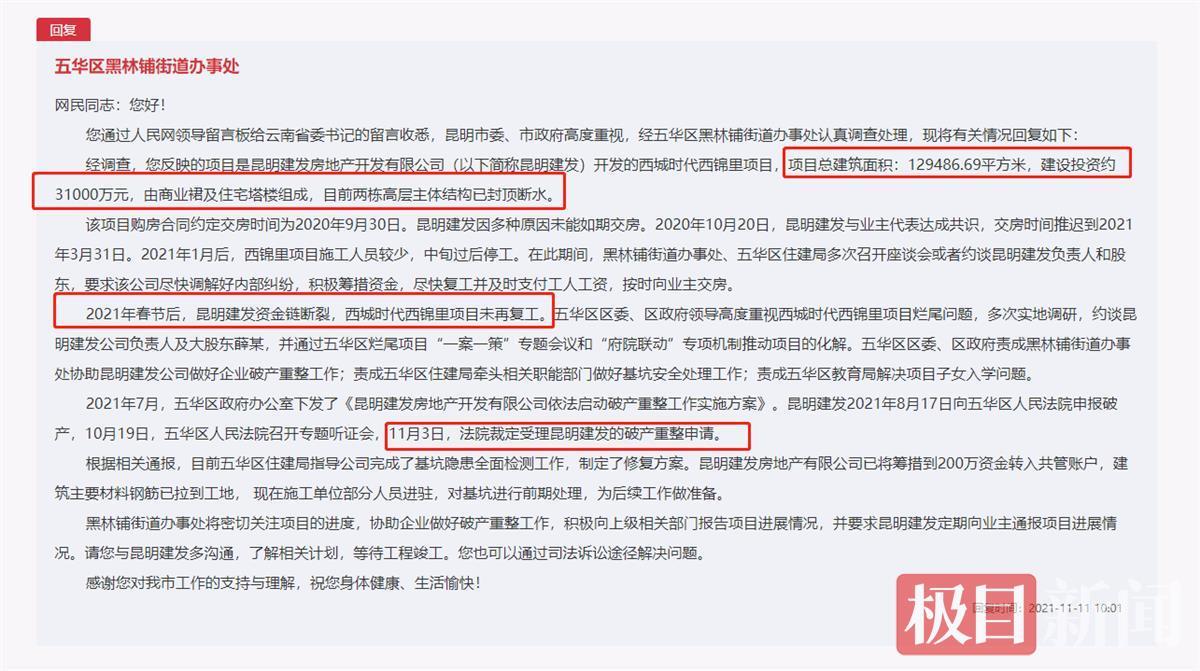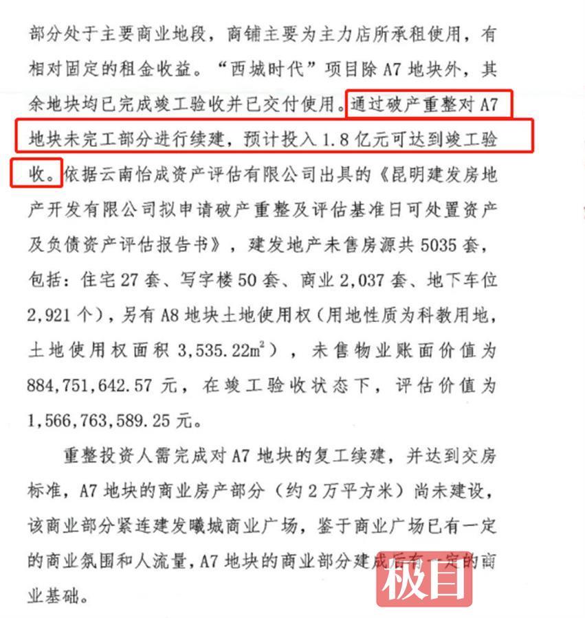 极目新闻记者获悉,2021年7月,昆明市五华区政府办公室下发了《昆明建发房地产开发有限公司依法启动破产重整工作实施方案》。昆明建发8月17日向五华区人民法院申报破产,10月19日,五华区人民法院召开专题听证会,11月3日,法院裁定受理昆明建发的破产重整申请。昆明建发发布的一份重整投资人招募公告显示,通过破产重整对该地块未完工部分进行续建,预计投入1.8亿元可达到竣工验收。