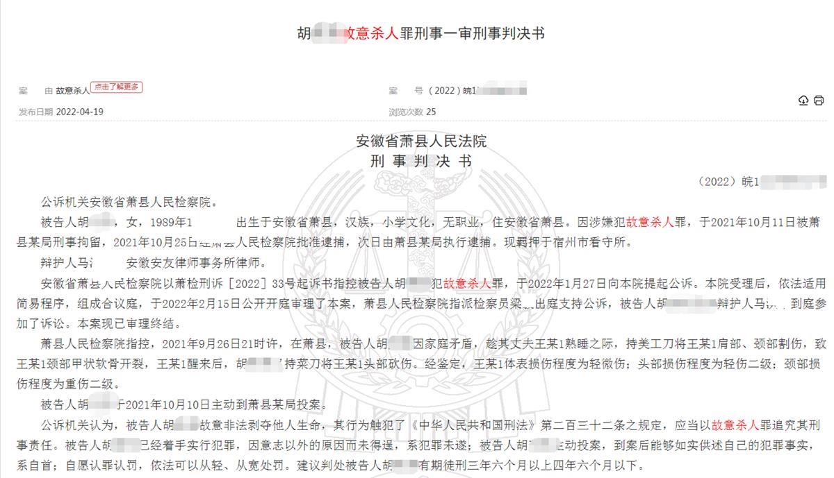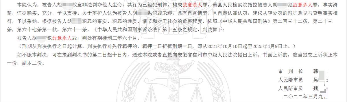 2022年3月9日,萧县人民法院判决被告人胡某犯故意杀人罪,判处有期徒刑三年六个月。