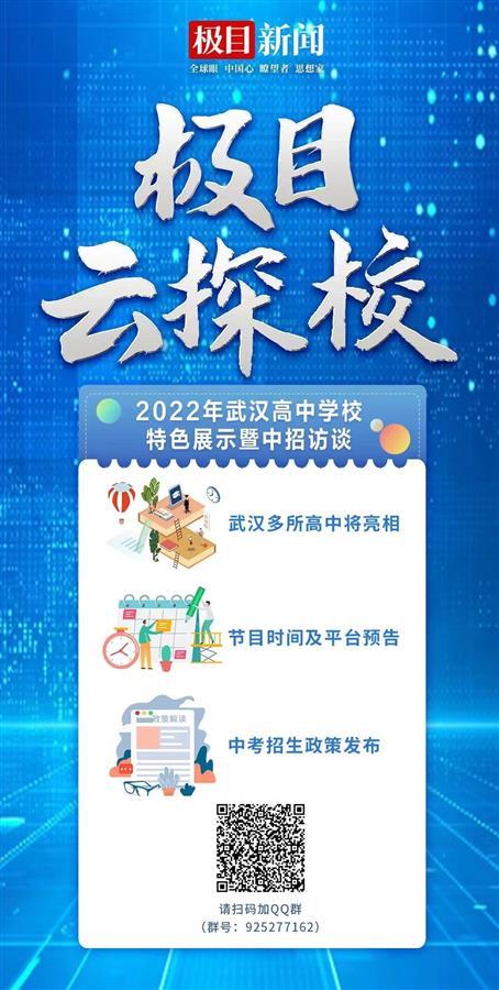 4月13日起,楚天都市报·极目新闻特别推出“极目云探校·2022年武汉高中学校特色展示暨中招访谈”节目,邀请武汉市一批高中学校校领导、招生负责人走进本报5G演播厅,就家长与学生关注的问题进行权威解答。武汉市初三学生家长可加入“极目新闻2022届初三家长群”(QQ群号:925277162),我们将及时在群内预告节目时间,发布中招权威资讯,解答家长疑惑。
