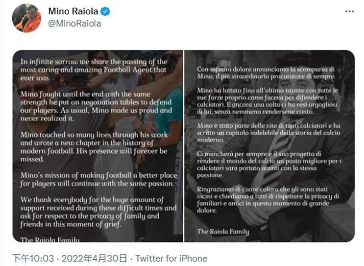 拉伊奥拉家人声明:怀着无比悲痛的心情,我们宣布足球界最有爱心、最不可思议的经纪人去世的消息。米诺一直战斗到了最后一刻,就像他在谈判桌上维护我们球员的利益一样。米诺让我们骄傲,而我们从来没有意识到这一点。