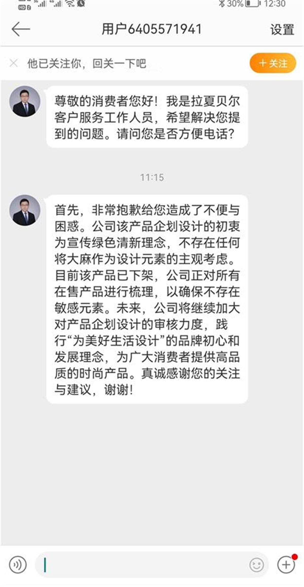 5月5日中午,电商平台回应记者称,客服收到该用户反馈的问题后,第一时间与品牌方核实了该问题。品牌方解释该图案是从品牌素材库里挑选的,没有特指某种植物。另外,平台与拉夏贝尔已没有合作,该商品已于去年11月停止售卖。