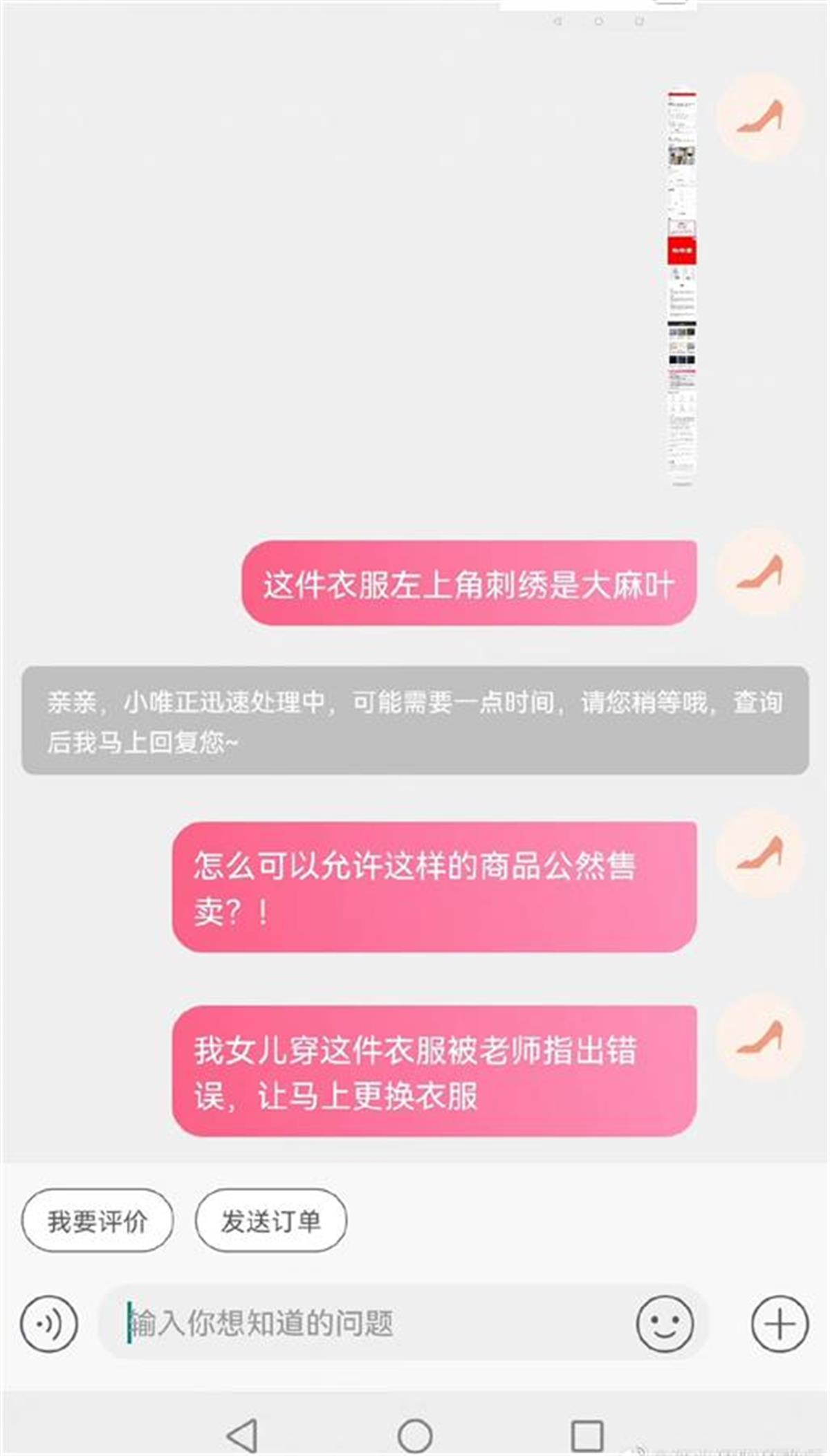 5月4日,有消费者发微博反映称,她从某知名电商平台上为女儿网购了一件拉夏贝尔的短袖,该短袖胸口有一片绿色树叶的图形,网站介绍显示其属于清新树叶系列。但女儿穿短袖上课时,却被老师指出该图形为大麻叶。该消费者立即向电商平台投诉,并要求平台及拉夏贝尔自查自纠。