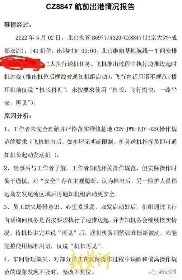 网传截图显示的内容,是CZ8847航前出港情况报告。报告中提到,2022年5月2日上午9时,CZ8847航班由北京大兴机场飞往成都双流机场前,由北京维修基地两名机务人员执行送机任务。送机过程中,两名机务人员存在飞机推出过程中执行边推边起时机过晚和机务人员用语不规范的问题,将标准用语“机长,飞行愉快,一路平安,再见”,简说成了“机长再见”。