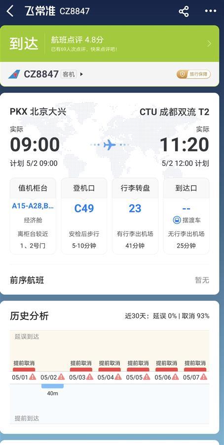 极目新闻记者查询飞常准发现,CZ8847航班由中国南方航空公司承运,5月2日上午九点,该航班确实从北京大兴机场飞往成都双流机场,且执飞机型、编号等均与网传截图信息一致,计划起飞时间和实际起飞时间均为上午9时。