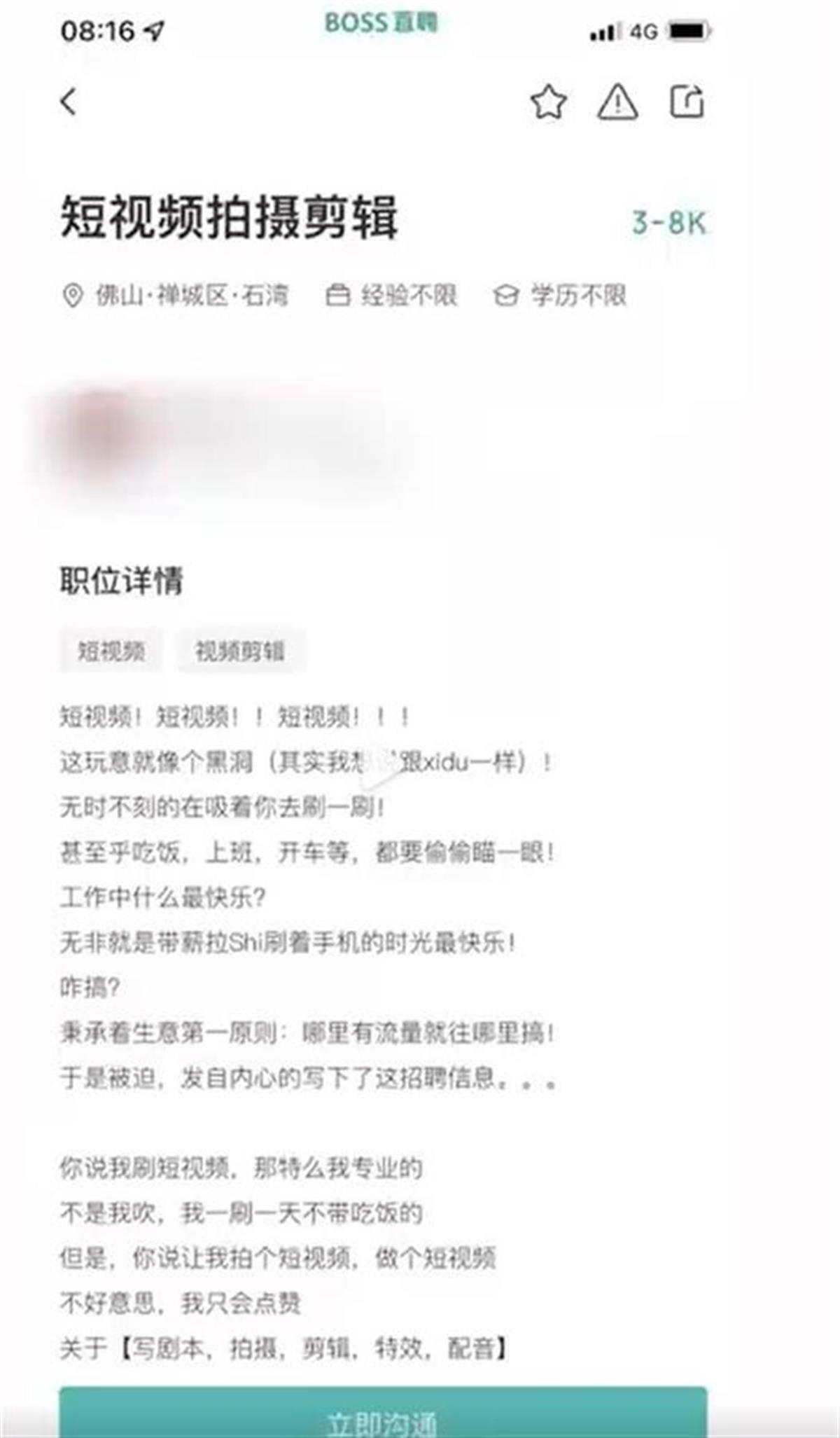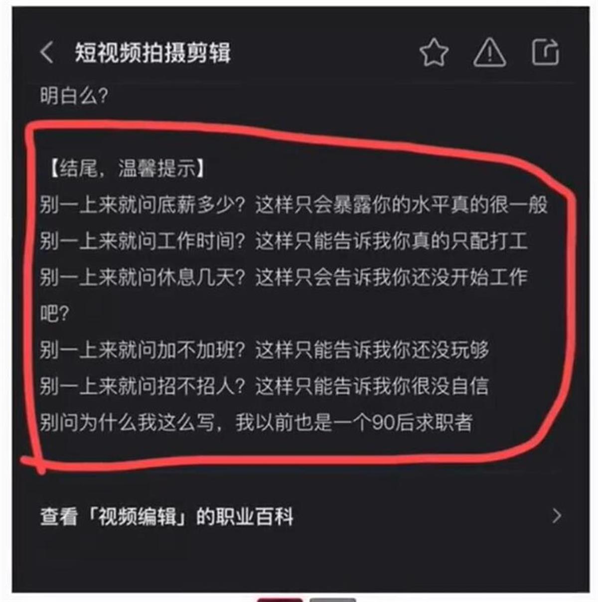 网传信息显示,发布招聘信息的为广东佛山的一家信息技术公司,招聘的工作岗位为短视频拍摄剪辑,但在岗位介绍中并没有提工资待遇、具体工作内容等,只是说为了追逐短视频的流量招短视频人才。更为奇葩的是招聘信息结尾“温馨提示”的内容。其中提到,“别上来就问底薪多少,这样只能证明你的水平很一般。”“别上来就问加不加班,这样只能告诉我你还没玩够。”