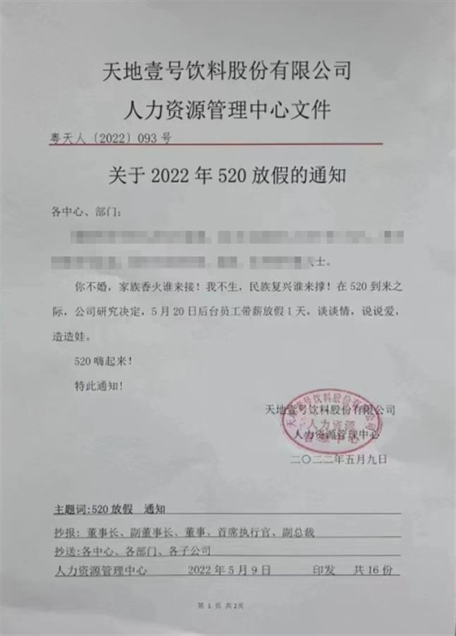 网传图片显示,天地壹号饮料股份有限公司发布一条关于2022年“520”的放假通知。通知中写道:“你不婚,家族香火谁来接!我不生,民族复兴谁来撑!在520到来之 际,公司研究决定,5月20日,后台员工带薪放假1天。谈谈情,说说爱, 造造娃。”落款为天地壹号饮料股份有限公司人力资源管理中心。