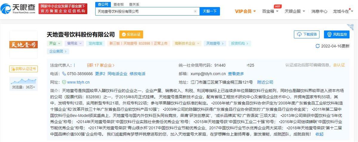 天眼查显示,天地壹号是我国较早入醋饮料行业的企业之一(网络截图)
