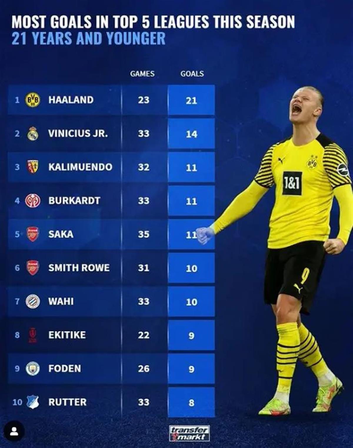今年即将年满22岁的哈兰德,效力德甲多特蒙德三个赛季,一共出场66次,打进61球,送出15次助攻,其中本赛季截至目前出场23次,打进21球,送出7次助攻。场均制造进球超过1球的效率,打出了欧洲足坛最顶级的数据表现。在本赛季五大联赛U21球员的排名中,哈兰德在联赛攻入21球,以领先第二名皇马维尼休斯7球的绝对优势位列榜首。