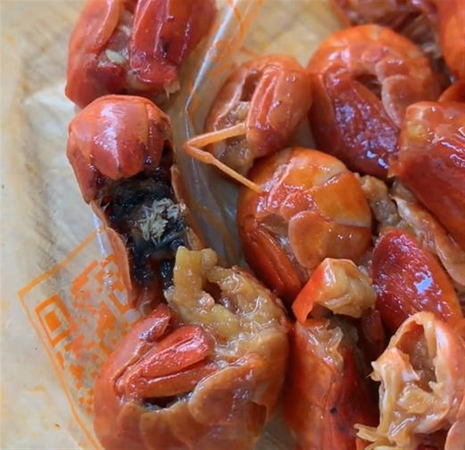 网友发布的视显示,一袋拆开的成品虾尾里,有一只虾尾呈暗黑色,而且黑色部分疑似有白色虫卵,包装袋上印有“杨帝煌”字样。视频发布者称:“我是在杨帝煌买的虾尾,生了虫卵,长了蛆,吓死人。”