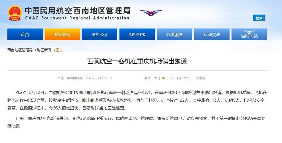 据民航西南地区管理局通报,5月12日,西藏航空公司TV9833航班在执行重庆—林芝客运任务时,在重庆机场起飞滑跑过程中偏出跑道。根据机组反映,飞机在起飞过程中出现异常,按程序中断起飞,偏出跑道后发动机擦地起火,目前已扑灭。机上共计122人,其中旅客113人,机组9人,已全部安全撤离。在撤离过程中,有36人擦伤扭伤,已及时送当地医院检查。