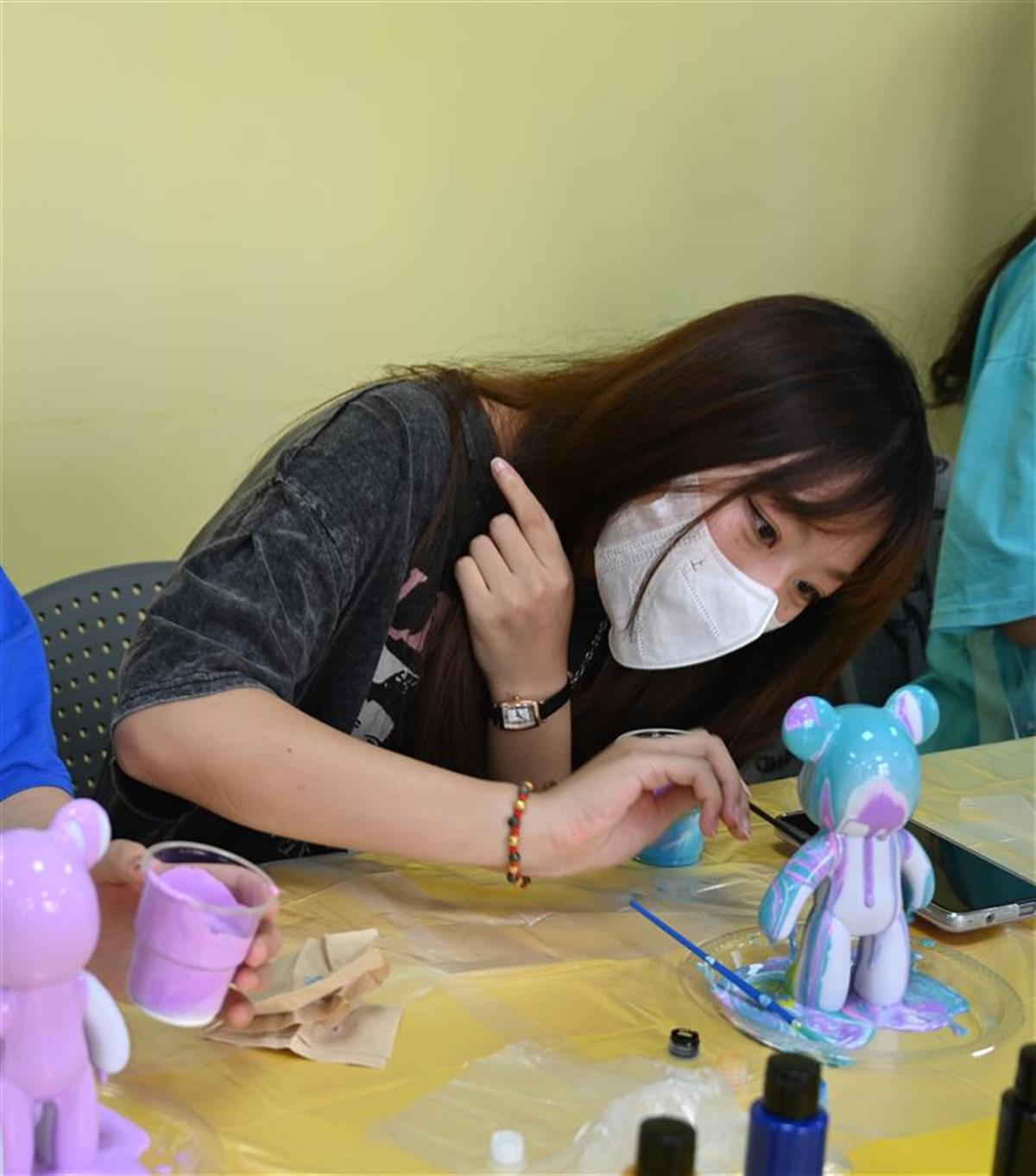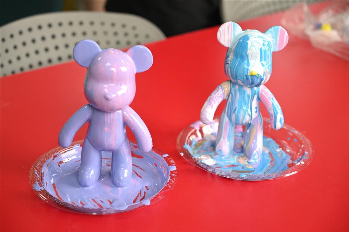 “戴好手套和围裙,避免将衣服弄脏;检查仔细小熊表面,避免有杂物导致液体颜料下滑不顺畅……”14时30分,该院举行了“DIY流体熊”活动,30余名同学齐聚现场,人手一只流体熊。活动指导老师文琴介绍完制作流程后,同学们便迫不及待开始了创作。不一会儿,现场就有了近40只成品。有酷炫风的黑灰色系,也有充满可爱氛围的粉红色系,还有自带清凉感的薄荷色系……“与流水线涂装、连夜排队买到的收藏品不同,自己手工上色的每一只流体熊,都堪称独一无二。”一名学生评价道。