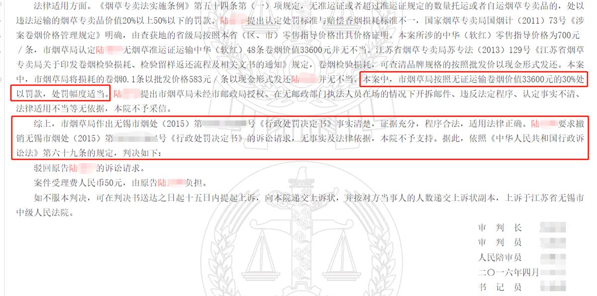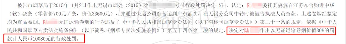 上述案例中,因妹妹结婚需要,陆女士委托其婆婆在江苏东台合法购进中华(软)香烟48条(价值33600元),并通过快递公司准备运到广东汕头,在无锡中转时被无锡市烟草专卖局查获。因无证运输烟草,陆女士被罚款10080元。陆女士就此向无锡市南长区人民法院提请了行政诉讼,主张撤销行政处罚。法院审理后认为,无锡市烟草专卖局作出的行政处罚合法合规,驳回了陆女士的诉讼请求。