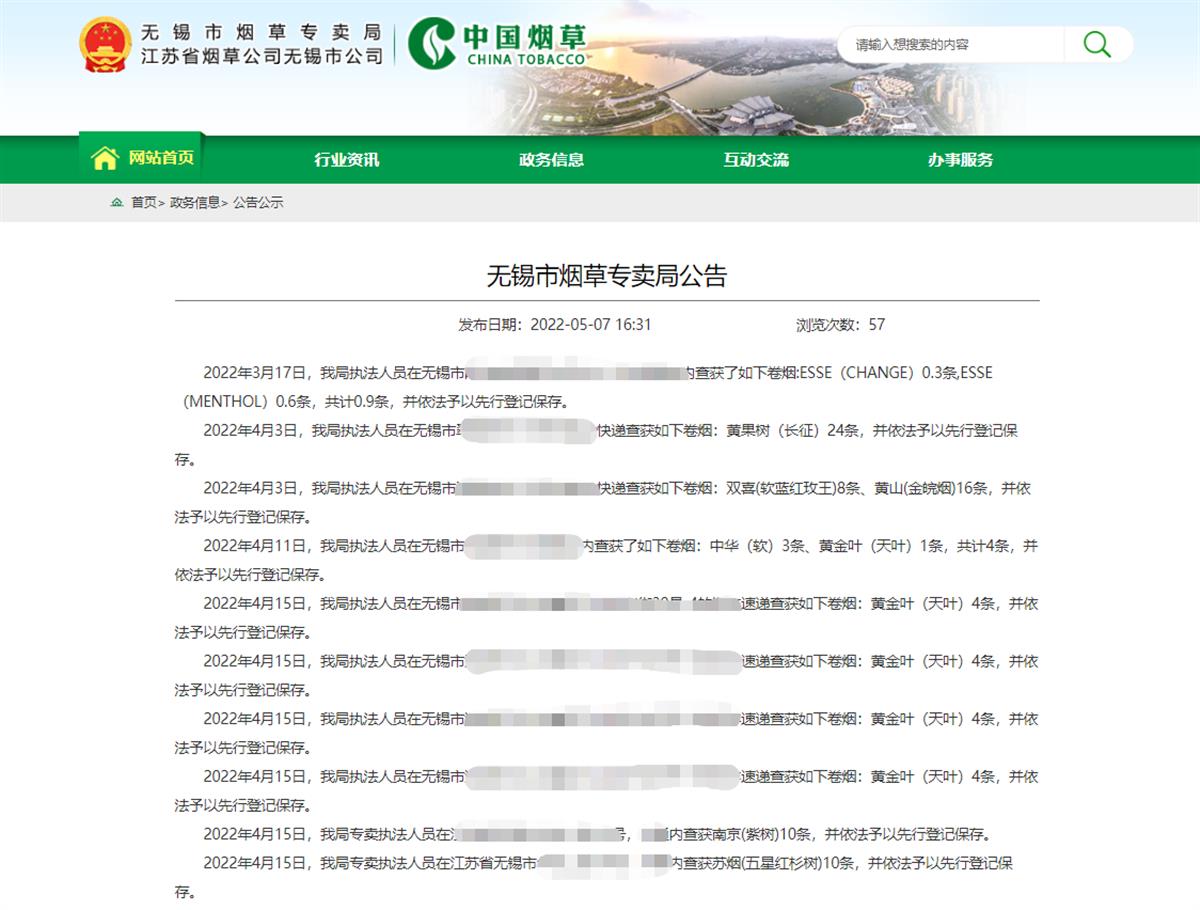 在快递点查获的卷烟公告(来源:无锡市烟草专卖局官网)